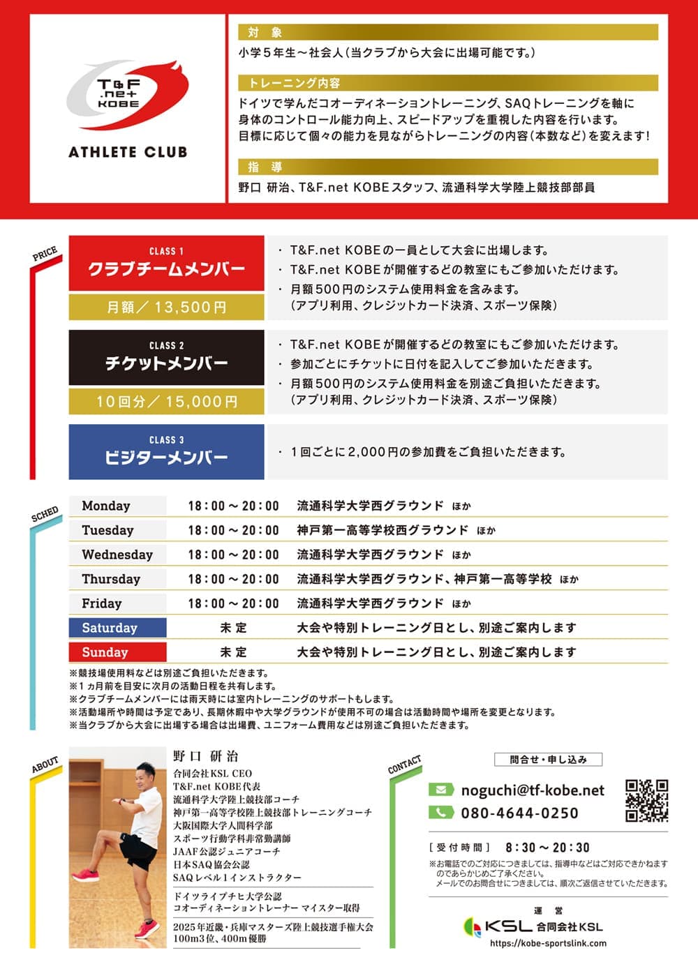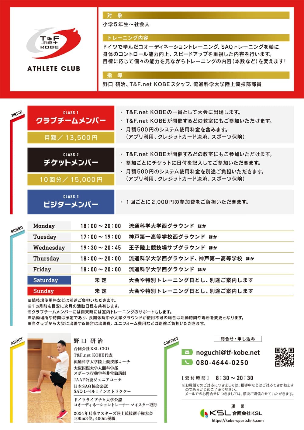 神戸トラック&フィールドスクール、しあわせの村「走り方教室」、コープ協同学苑「走りの基本」教室、王子スポーツセンター春・夏・冬短期かけっこ教室などで単発の教室を実施しています。